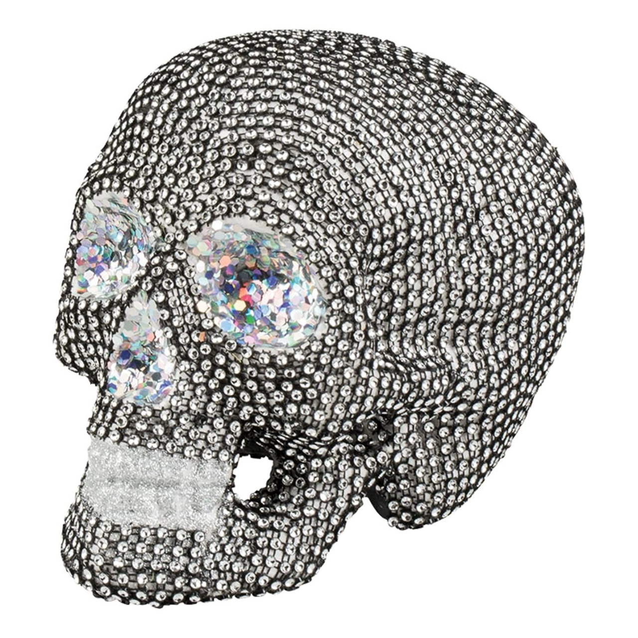 Döskalle täckt med med glitter, gnistrande strass och holografiska paljetter i ögonhålor och näsa.